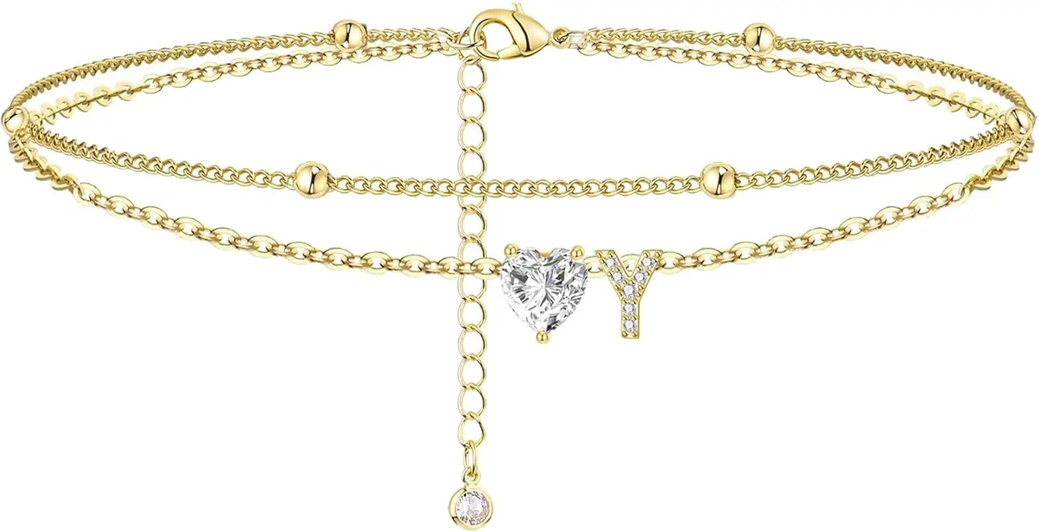 14K Gold Plated CZ Initial Heart Anklet, Waterproof