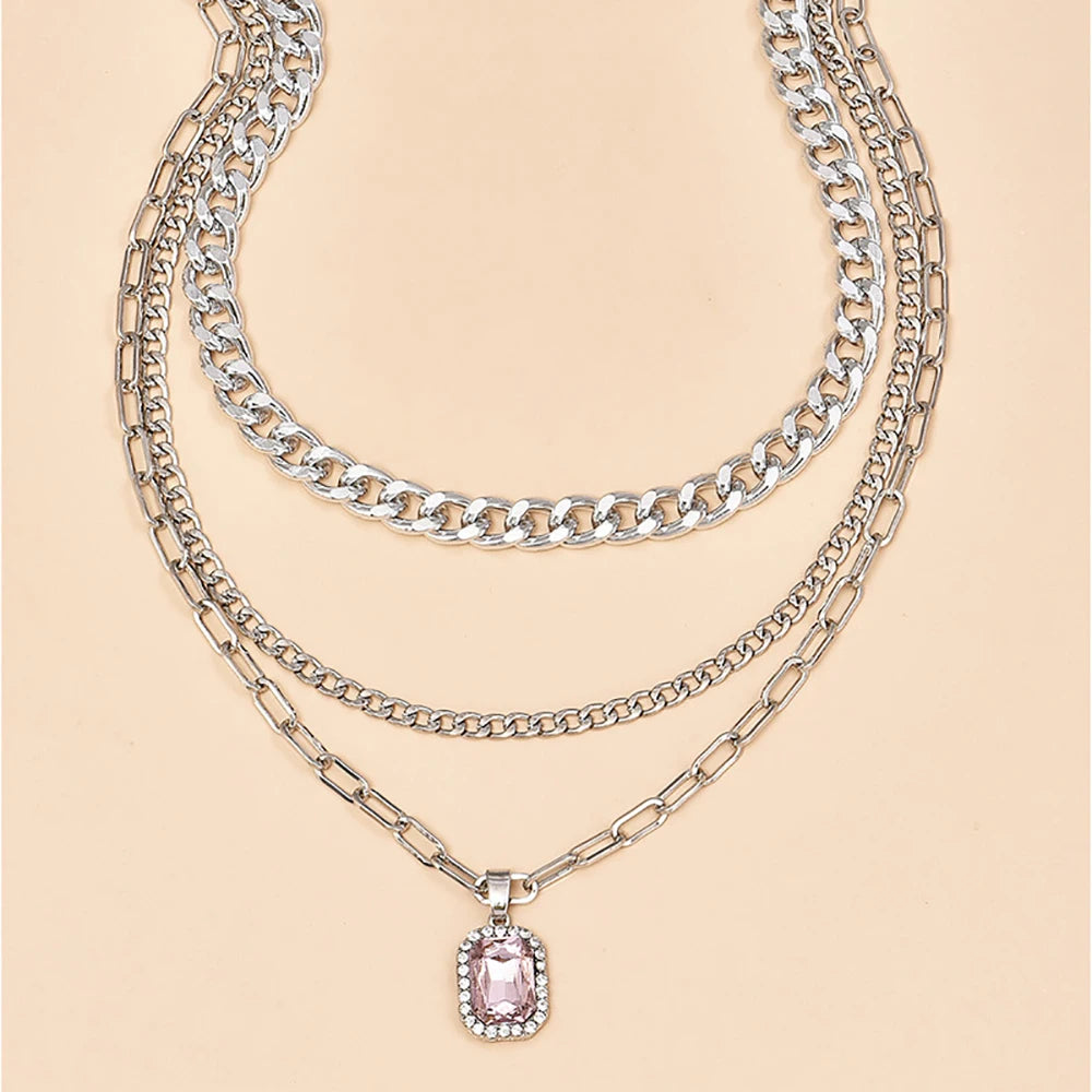 Silver Multi-layer Chain Necklace with Crystal Pendan